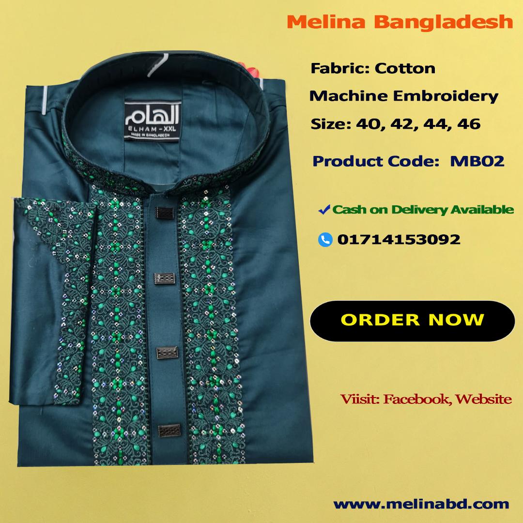 Elegant and Premium Men’s Panjabi crafted from 100% high-quality breathable cotton fabric, adorned with fine stitching, premium-quality embroidery and timeless design for a refined traditional look. Melina Bangladesh’s traditional Panjabi blends comfort with classic style and fit. Melina Bangladesh’s Panjabi is perfect for festivals, weddings, or casual wear.