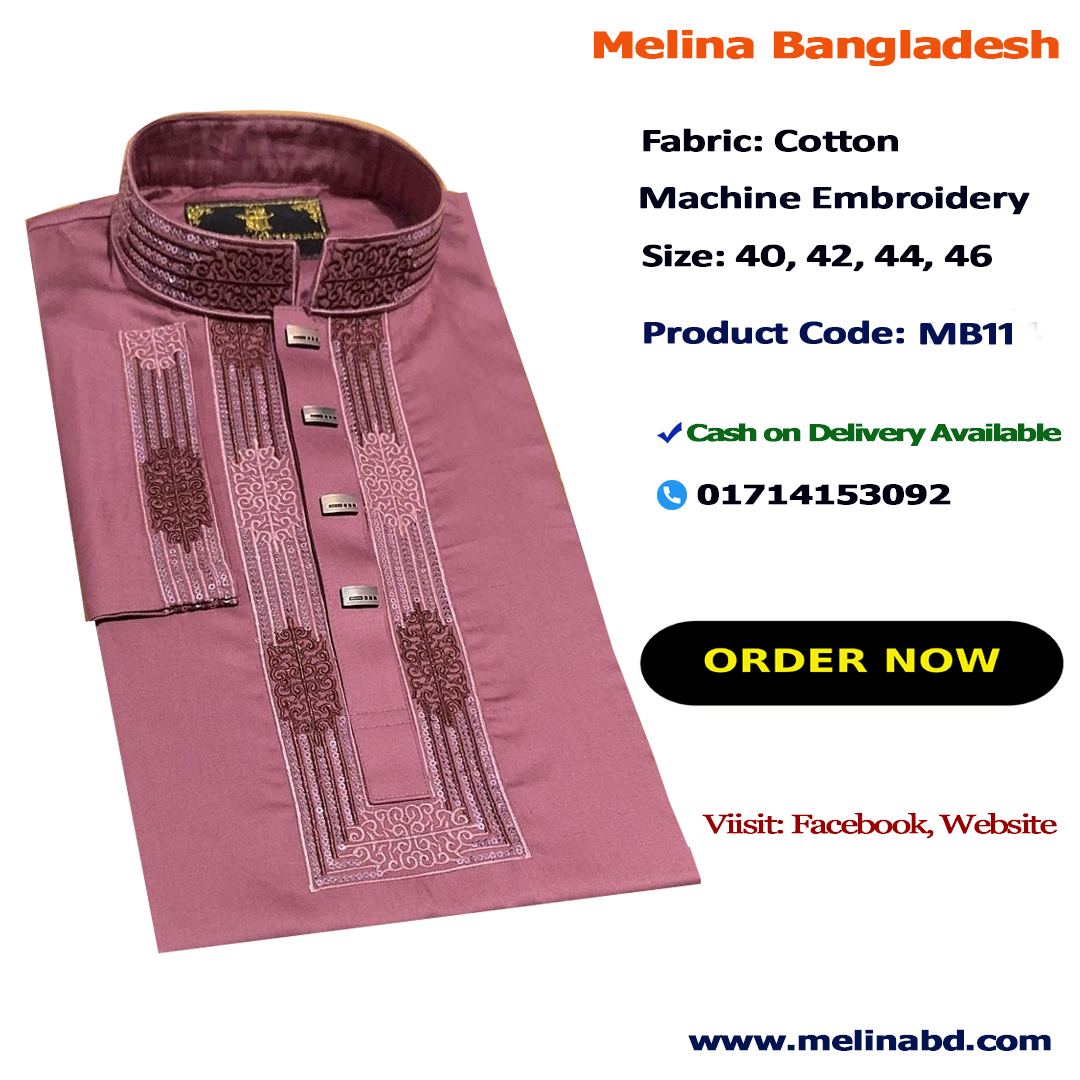 Elegant and Premium Men’s Panjabi crafted from 100% high-quality breathable cotton fabric, adorned with fine stitching, premium-quality embroidery and timeless design for a refined traditional look. Melina Bangladesh’s traditional Panjabi blends comfort with classic style and fit. Melina Bangladesh’s Panjabi is perfect for festivals, weddings, or casual wear.