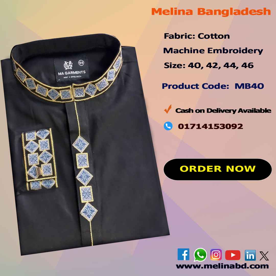 Elegant and Premium Men’s Panjabi crafted from 100% high-quality breathable cotton fabric, adorned with fine stitching, premium-quality embroidery and timeless design for a refined traditional look. Melina Bangladesh’s traditional Panjabi blends comfort with classic style and fit. Melina Bangladesh’s Panjabi is perfect for festivals, weddings, or casual wear.