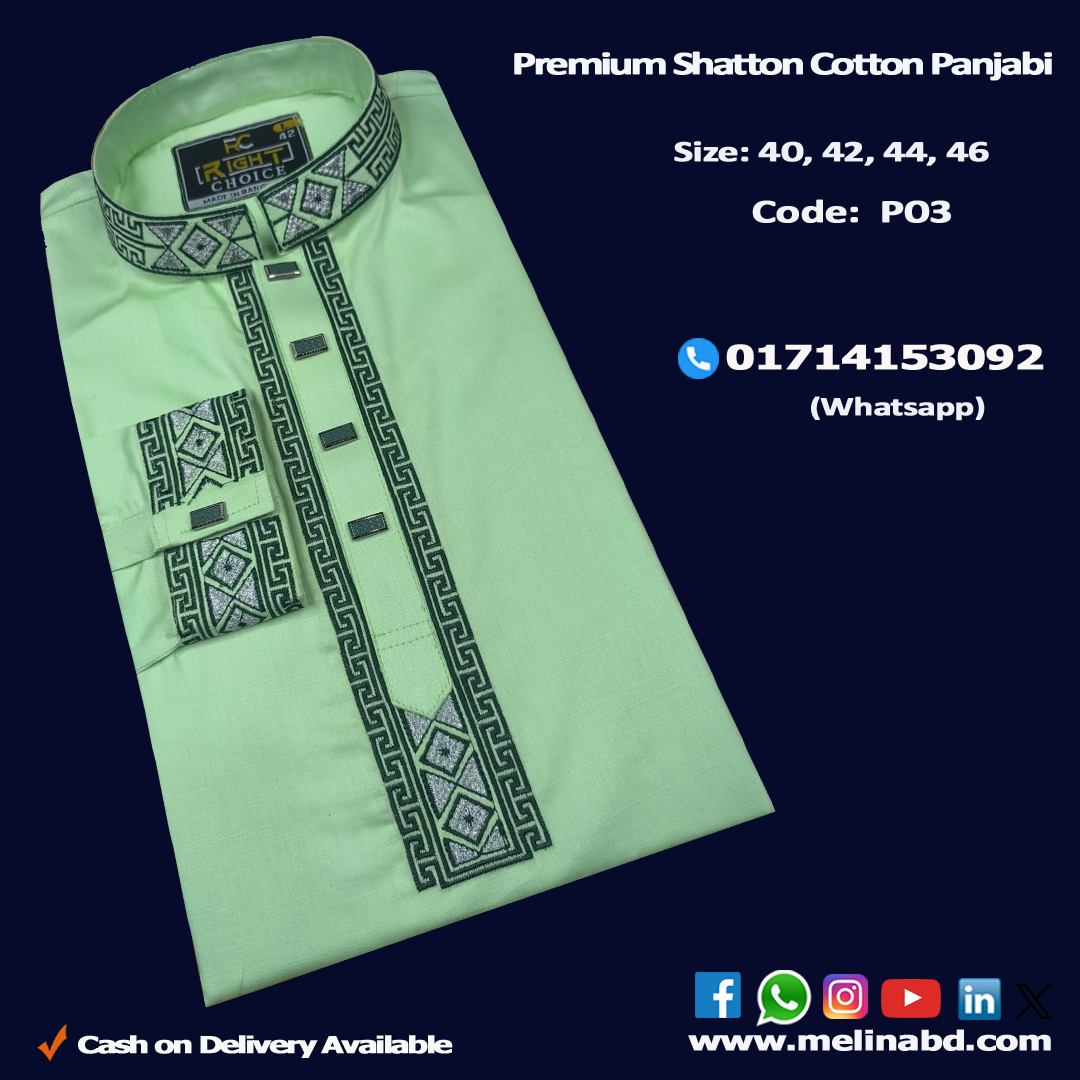 Elegant and Premium Men’s Panjabi crafted from 100% high-quality breathable cotton fabric, adorned with fine stitching, premium-quality embroidery and timeless design for a refined traditional look. Melina Bangladesh’s traditional Panjabi blends comfort with classic style and fit. Melina Bangladesh’s Panjabi is perfect for festivals, weddings, or casual wear.